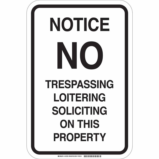 This is manufactured by Brady Corporation. The manufacturer part number is 103700. Label with a size of 18.00" l x 12.00" w (457.2mm x 304.8mm). The product is rohs3 compliant. It is assigned with possible HTSUS value of 8310.00.0000. It has a classic black legend, white background colour. The product brady®, is a highly preferred choice for users. The product is made from highly stable and reliable aluminum. In addition, it is reach unaffected. Its typical moisture sensitivity level is not applicable. In addition, bulk is the available packaging type of the product. A bespoke label is a notice. no trespassing loitering soliciting on this property label. The product is suitable for use with notice. It has a long 4 weeks standard lead time. The brady corporation's product offers user-desired applications. The product is designated with the ear99 code number.