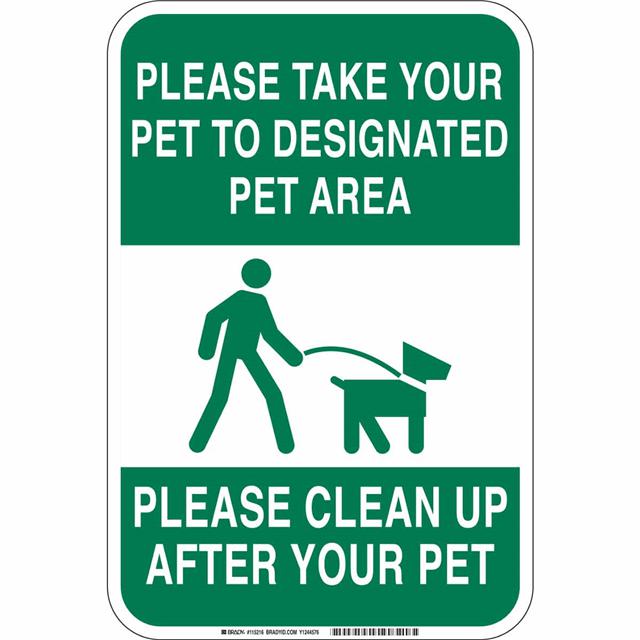 This is manufactured by Brady Corporation. The manufacturer part number is 115216. Label with a size of 18.00" l x 12.00" w (457.2mm x 304.8mm). The product is rohs3 compliant. It is assigned with possible HTSUS value of 8310.00.0000. It has a classic green legend, white background colour. The product brady®, is a highly preferred choice for users. The product is made from highly stable and reliable aluminum. In addition, it is reach unaffected. Its typical moisture sensitivity level is not applicable. In addition, bulk is the available packaging type of the product. A bespoke label is a please take your pet to designated pet area. please clean up after your pet label. The product is suitable for use with warning. It has a long 4 weeks standard lead time. The brady corporation's product offers user-desired applications. The product is designated with the ear99 code number.