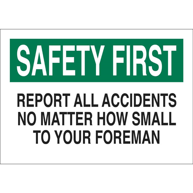 This is manufactured by Brady Corporation. The manufacturer part number is 122722. Label with a size of 14.00" l x 10.00" w (355.6mm x 254.0mm). The product is rohs3 compliant. It is assigned with possible HTSUS value of 3926.90.9989. It has a classic black and green legend, white background colour. The product brady®, is a highly preferred choice for users. The product is made from highly stable and reliable fiberglass. In addition, it is reach unaffected. Its typical moisture sensitivity level is not applicable. In addition, bulk is the available packaging type of the product. A bespoke label is a safety first. report all accidents no matter how small to your foreman label. The product is suitable for use with warning. It has a long 4 weeks standard lead time. The brady corporation's product offers user-desired applications. The product is designated with the ear99 code number.