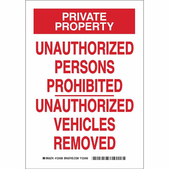 This is manufactured by Brady Corporation. The manufacturer part number is 123499. Label with a size of 14.00" l x 10.00" w (355.6mm x 254.0mm). The product is rohs3 compliant. It is assigned with possible HTSUS value of 8310.00.0000. It is shipped in bulk package . It has a classic red legend, white background colour. The product brady®, is a highly preferred choice for users. The product is made from highly stable and reliable aluminum. In addition, it is reach unaffected. Its typical moisture sensitivity level is not applicable. A bespoke label is a privateproperty. unauthorized persons prohibited unauthorized vehicles removed label. The product is suitable for use with warning. It has a long 4 weeks standard lead time. The product is designated with the ear99 code number.