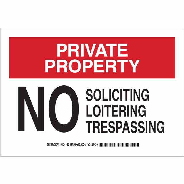 This is manufactured by Brady Corporation. The manufacturer part number is 124862. Label with a size of 14.00" l x 10.00" w (355.6mm x 254.0mm). The product is rohs3 compliant. It is assigned with possible HTSUS value of 3926.90.9989. It has a classic black and red legend, white background colour. The product brady®, is a highly preferred choice for users. The product is made from highly stable and reliable polyester. In addition, it is reach unaffected. Its typical moisture sensitivity level is not applicable. In addition, bulk is the available packaging type of the product. A bespoke label is a private property. no soliciting loitering trespassing label. The product is suitable for use with warning. It has a long 4 weeks standard lead time. The brady corporation's product offers user-desired applications. The product is designated with the ear99 code number.