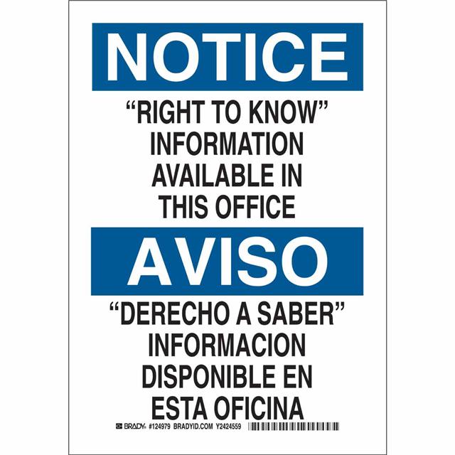 This is manufactured by Brady Corporation. The manufacturer part number is 124980. Label with a size of 14.00" l x 10.00" w (355.6mm x 254.0mm). The product is rohs3 compliant. It is assigned with possible HTSUS value of 8310.00.0000. It is shipped in bulk package . It has a classic black and blue legend, white background colour. The product brady®, is a highly preferred choice for users. The product is made from highly stable and reliable aluminum. In addition, it is reach unaffected. Its typical moisture sensitivity level is not applicable. A bespoke label is a notice/aviso. right to know information available in this office / "derecho a saber" informacion disponible en esta oficina label. The product is suitable for use with notice. The product is designated with the ear99 code number.
