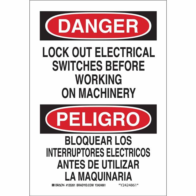 This is manufactured by Brady Corporation. The manufacturer part number is 125262. Label with a size of 14.00" l x 10.00" w (355.6mm x 254.0mm). The product is rohs3 compliant. It is assigned with possible HTSUS value of 8310.00.0000. It is shipped in bulk package . It has a classic black and red legend, white background colour. The product brady®, is a highly preferred choice for users. The product is made from highly stable and reliable aluminum. In addition, it is reach unaffected. Its typical moisture sensitivity level is not applicable. A bespoke label is a danger/peligro. lock out electrical switches before working on machinery/bloquear los interruptores electricos antes de utiliz… label. It has a long 4 weeks standard lead time. The product is designated with the ear99 code number.