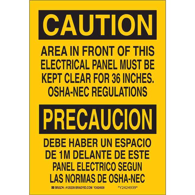 This is manufactured by Brady Corporation. The manufacturer part number is 125340. Label with a size of 14.00" l x 10.00" w (355.6mm x 254.0mm). The product is not applicable. It is assigned with possible HTSUS value of 8310.00.0000. It is shipped in bulk package . It has a classic black legend, yellow background colour. The product brady®, is a highly preferred choice for users. The product is made from highly stable and reliable aluminum. In addition, it is reach affected. Its typical moisture sensitivity level is not applicable. A bespoke label is a caution/precaucion. area in front of this electrical panel must be kept clear for 36 inches label. The product is suitable for use with caution. It has a long 4 weeks standard lead time. The product is designated with the ear99 code number.