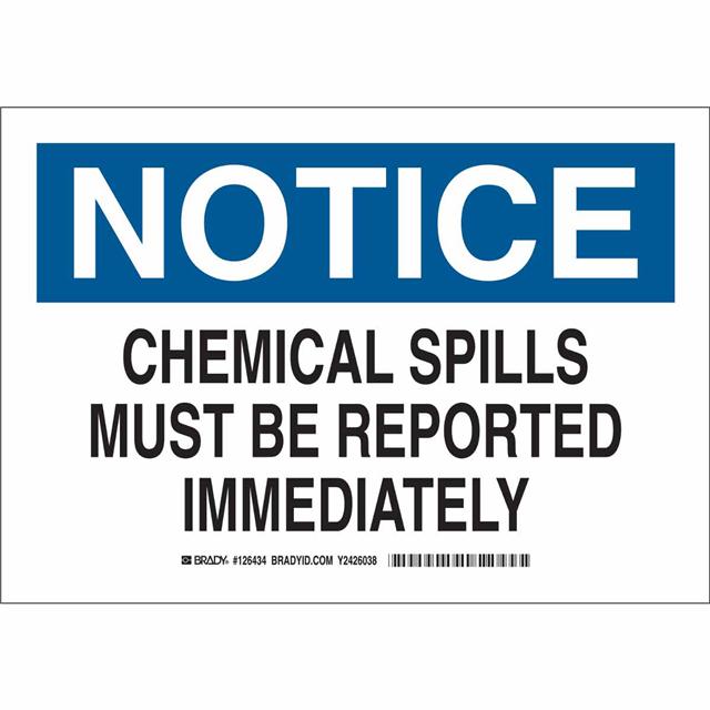 This is manufactured by Brady Corporation. The manufacturer part number is 126435. Label with a size of 14.00" l x 10.00" w (355.6mm x 254.0mm). The product is rohs3 compliant. It is assigned with possible HTSUS value of 8310.00.0000. It is shipped in bulk package . It has a classic black and blue legend, white background colour. The product brady®, is a highly preferred choice for users. The product is made from highly stable and reliable aluminum. In addition, it is reach unaffected. Its typical moisture sensitivity level is not applicable. A bespoke label is a notice. chemical spills must be reported immediately label. The product is suitable for use with notice. It has a long 4 weeks standard lead time. The product is designated with the ear99 code number.