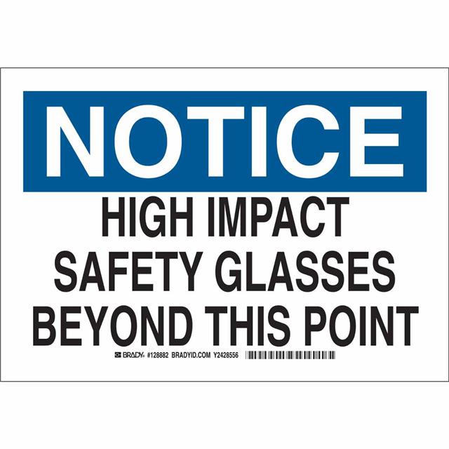 This is manufactured by Brady Corporation. The manufacturer part number is 128883. Label with a size of 14.00" l x 10.00" w (355.6mm x 254.0mm). The product is rohs3 compliant. It is assigned with possible HTSUS value of 8310.00.0000. It is shipped in bulk package . It has a classic black and blue legend, white background colour. The product brady®, is a highly preferred choice for users. The product is made from highly stable and reliable aluminum. In addition, it is reach unaffected. Its typical moisture sensitivity level is not applicable. A bespoke label is a notice. high impact safety glasses beyond this point label. The product is suitable for use with notice. The product is designated with the ear99 code number.