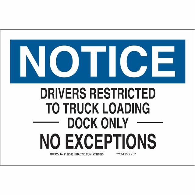 This is manufactured by Brady Corporation. The manufacturer part number is 129536. Label with a size of 14.00" l x 10.00" w (355.6mm x 254.0mm). The product is rohs3 compliant. It is assigned with possible HTSUS value of 3926.90.9985. It is shipped in bulk package . It has a classic black and blue legend, white background colour. The product brady®, is a highly preferred choice for users. The product is made from highly stable and reliable polyester. In addition, it is reach unaffected. Its typical moisture sensitivity level is not applicable. A bespoke label is a notice. drivers restricted to truck loading dock only no exceptions label. The product is suitable for use with notice. It has a long 4 weeks standard lead time. The product is designated with the ear99 code number.
