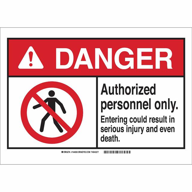 This is manufactured by Brady Corporation. The manufacturer part number is 144593. Label with a size of 14.00" l x 10.00" w (355.6mm x 254.0mm). The product is rohs3 compliant. It is assigned with possible HTSUS value of 3926.90.9985. It is shipped in bulk package . It has a classic black and red legend, white background colour. The product brady®, is a highly preferred choice for users. The product is made from highly stable and reliable polyester. In addition, it is reach unaffected. Its typical moisture sensitivity level is not applicable. A bespoke label is a danger. authorized personnel only. entering could result in serious injury and even deat label. The product is suitable for use with danger. The product is designated with the ear99 code number.