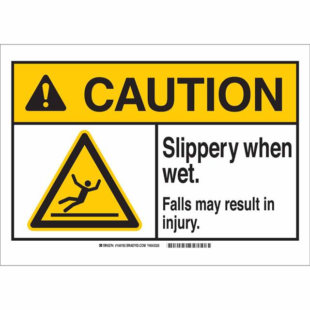 This is manufactured by Brady Corporation. The manufacturer part number is 144762. Label with a size of 14.00" l x 10.00" w (355.6mm x 254.0mm). The product is rohs3 compliant. It is assigned with possible HTSUS value of 3926.90.9985. It is shipped in bulk package . It has a classic black and yellow legend, white background colour. The product brady®, is a highly preferred choice for users. The product is made from highly stable and reliable polyester. In addition, it is reach unaffected. Its typical moisture sensitivity level is not applicable. A bespoke label is a caution. slippery when wet. falls may result in injury label. The product is suitable for use with caution. It has a long 4 weeks standard lead time. The product is designated with the ear99 code number.
