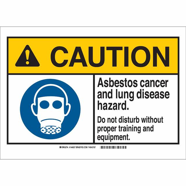 This is manufactured by Brady Corporation. The manufacturer part number is 144837. Label with a size of 14.00" l x 10.00" w (355.6mm x 254.0mm). The product is rohs3 compliant. It is assigned with possible HTSUS value of 3926.90.9985. It is shipped in bulk package . It has a classic black and yellow legend, white background colour. The product brady®, is a highly preferred choice for users. The product is made from highly stable and reliable polyester. In addition, it is reach unaffected. Its typical moisture sensitivity level is not applicable. A bespoke label is a caution. asbestos. cancer and lung disease hazard. do not disturb without proper training and equipment label. It has a long 4 weeks standard lead time. The product is designated with the ear99 code number.