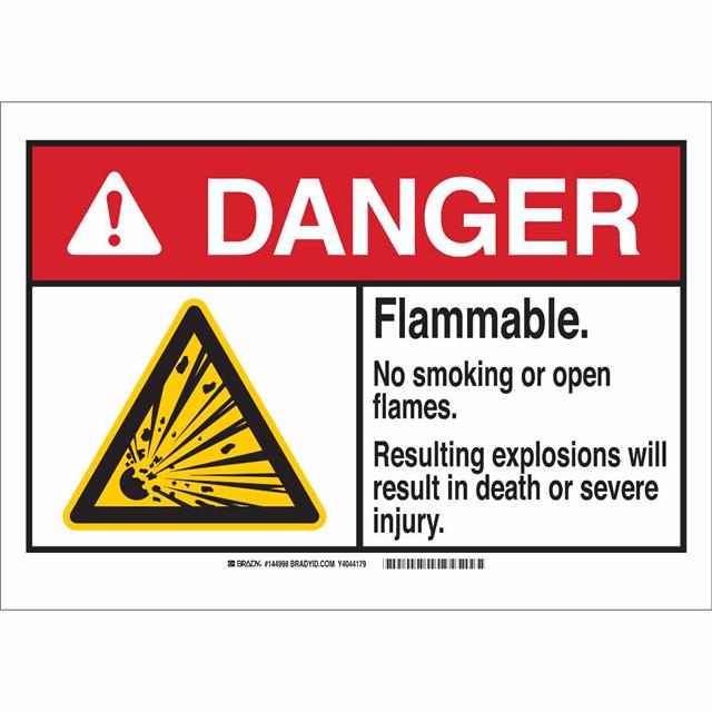 This is manufactured by Brady Corporation. The manufacturer part number is 144994. Label with a size of 14.00" l x 10.00" w (355.6mm x 254.0mm). The product is rohs3 compliant. It is assigned with possible HTSUS value of 8310.00.0000. It is shipped in bulk package . It has a classic black, red and yellow legend, white background colour. The product brady®, is a highly preferred choice for users. The product is made from highly stable and reliable aluminum. In addition, it is reach unaffected. Its typical moisture sensitivity level is not applicable. A bespoke label is a danger. flammable. no smoking or open flames. resulting explosions will result in death label. The product is suitable for use with danger. The product is designated with the ear99 code number.