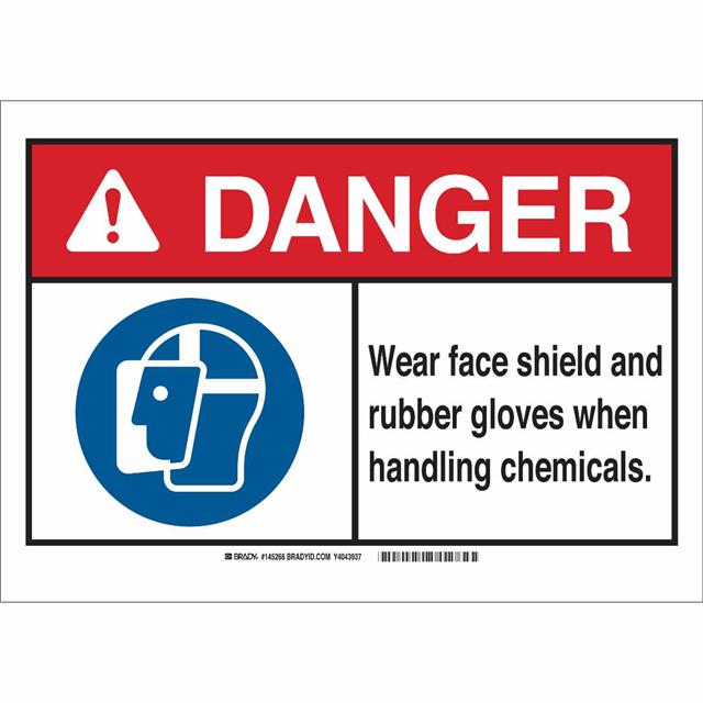 This is manufactured by Brady Corporation. The manufacturer part number is 145270. Label with a size of 14.00" l x 10.00" w (355.6mm x 254.0mm). The product is rohs3 compliant. It is assigned with possible HTSUS value of 8310.00.0000. It is shipped in bulk package . It has a classic black, blue and red legend, white background colour. The product brady®, is a highly preferred choice for users. The product is made from highly stable and reliable aluminum. In addition, it is reach unaffected. Its typical moisture sensitivity level is not applicable. A bespoke label is a danger. wear face shield and rubber gloves when handling chemicals label. The product is suitable for use with danger. It has a long 4 weeks standard lead time. The product is designated with the ear99 code number.