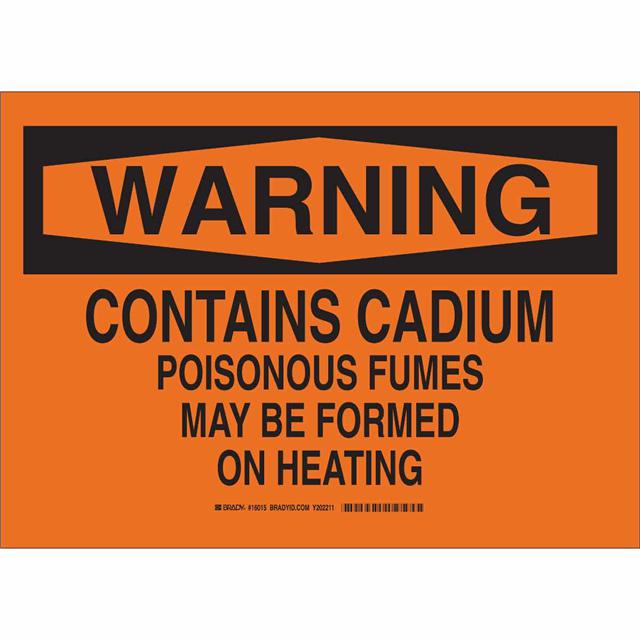 This is manufactured by Brady Corporation. The manufacturer part number is 16015. Label with a size of 14.00" l x 10.00" w (355.6mm x 254.0mm). The product is not applicable. It is assigned with possible HTSUS value of 3926.90.9985. It is shipped in bulk package . It has a classic black legend, orange background colour. The product brady®, is a highly preferred choice for users. The product is made from highly stable and reliable polyester. In addition, it is reach unaffected. Its typical moisture sensitivity level is not applicable. A bespoke label is a warning. contains cadmium poisonous fumes may be formed on heating label. The product is suitable for use with warning. It has a long 4 weeks standard lead time. The product is designated with the ear99 code number.