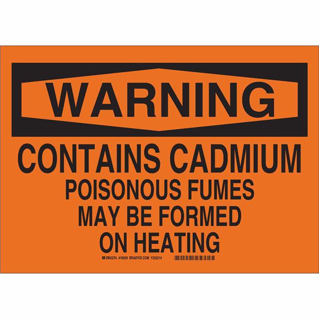 This is manufactured by Brady Corporation. The manufacturer part number is 16029. Label with a size of 14.00" l x 10.00" w (355.6mm x 254.0mm). The product is rohs3 compliant. It is assigned with possible HTSUS value of 8310.00.0000. It is shipped in bulk package . It has a classic black legend, orange background colour. The product brady®, is a highly preferred choice for users. The product is made from highly stable and reliable aluminum. In addition, it is reach unaffected. Its typical moisture sensitivity level is not applicable. A bespoke label is a warning. contains cadmium poisonous fumes may be formed on heating label. The product is suitable for use with warning. The product is designated with the ear99 code number.