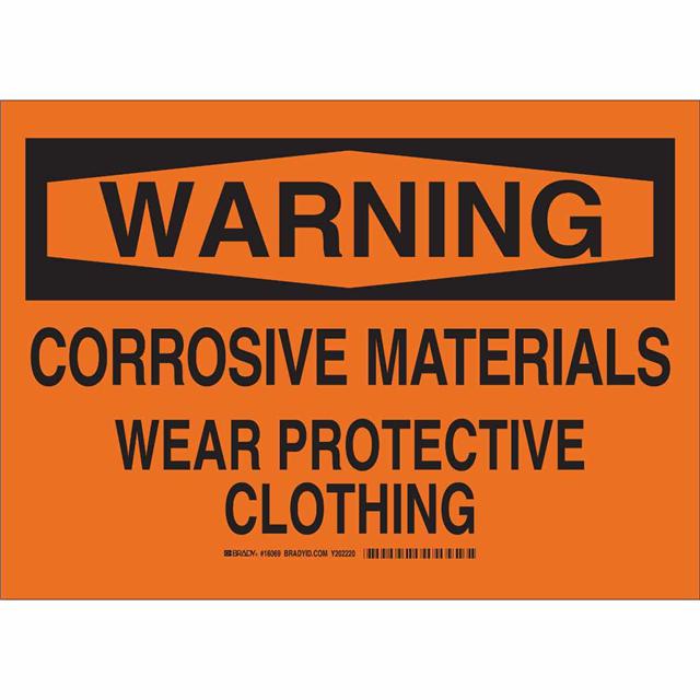 This is manufactured by Brady Corporation. The manufacturer part number is 16069. Label with a size of 14.00" l x 10.00" w (355.6mm x 254.0mm). The product is rohs3 compliant. It is assigned with possible HTSUS value of 8310.00.0000. It is shipped in bulk package . It has a classic black legend, orange background colour. The product brady®, is a highly preferred choice for users. The product is made from highly stable and reliable aluminum. In addition, it is reach unaffected. Its typical moisture sensitivity level is not applicable. A bespoke label is a warning. corrosive materials wear protective clothing label. The product is suitable for use with warning. It has a long 4 weeks standard lead time. The product is designated with the ear99 code number.