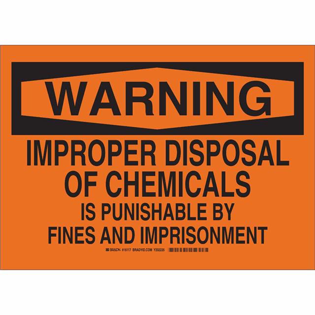 This is manufactured by Brady Corporation. The manufacturer part number is 16117. Label with a size of 14.00" l x 10.00" w (355.6mm x 254.0mm). The product is not applicable. It is assigned with possible HTSUS value of 3926.90.9985. It is shipped in bulk package . It has a classic black legend, orange background colour. The product brady®, is a highly preferred choice for users. The product is made from highly stable and reliable polyester. In addition, it is reach unaffected. Its typical moisture sensitivity level is not applicable. A bespoke label is a warning. improper disposal of chemicals is punishable by fines and imprisonment label. The product is suitable for use with warning. The product is designated with the ear99 code number.