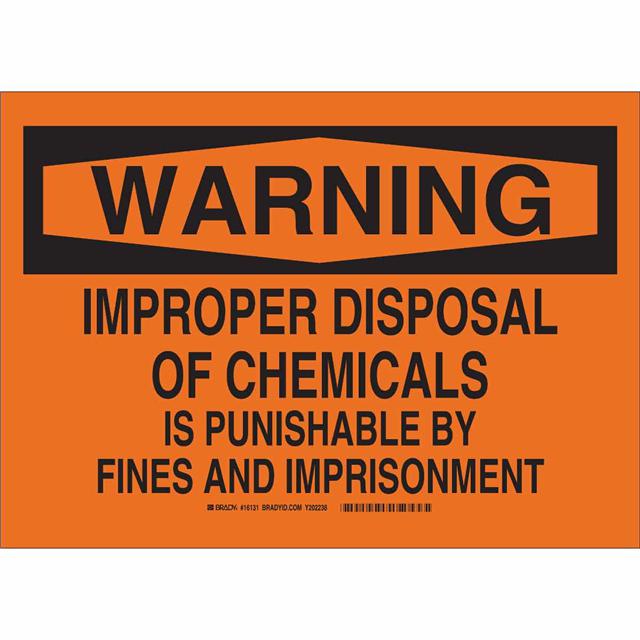 This is manufactured by Brady Corporation. The manufacturer part number is 16131. Label with a size of 14.00" l x 10.00" w (355.6mm x 254.0mm). The product is rohs3 compliant. It is assigned with possible HTSUS value of 8310.00.0000. It is shipped in bulk package . It has a classic black legend, orange background colour. The product brady®, is a highly preferred choice for users. The product is made from highly stable and reliable aluminum. In addition, it is reach unaffected. Its typical moisture sensitivity level is not applicable. A bespoke label is a warning. improper disposal of chemicals is punishable by fines and imprisonment label. The product is suitable for use with warning. It has a long 4 weeks standard lead time. The product is designated with the ear99 code number.