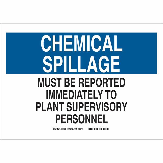 This is manufactured by Brady Corporation. The manufacturer part number is 18250. Label with a size of 14.00" l x 10.00" w (355.6mm x 254.0mm). The product is rohs3 compliant. It is assigned with possible HTSUS value of 3926.90.9985. It is shipped in bulk package . It has a classic black and blue legend, white background colour. The product brady®, is a highly preferred choice for users. The product is made from highly stable and reliable polyester. In addition, it is reach unaffected. Its typical moisture sensitivity level is not applicable. A bespoke label is a chemical spillage. must be reported immediately to plant supervisory personnel label. The product is suitable for use with warning. The product is designated with the ear99 code number.