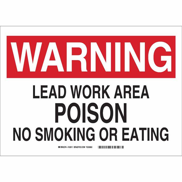 This is manufactured by Brady Corporation. The manufacturer part number is 18911. Label with a size of 14.00" l x 10.00" w (355.6mm x 254.0mm). The product is rohs3 compliant. It is assigned with possible HTSUS value of 8310.00.0000. It is shipped in bulk package . It has a classic black and red legend, white background colour. The product brady®, is a highly preferred choice for users. The product is made from highly stable and reliable aluminum. In addition, it is reach unaffected. Its typical moisture sensitivity level is not applicable. A bespoke label is a warning. lead work area poison no smoking or eating label. The product is suitable for use with warning. It has a long 4 weeks standard lead time. The product is designated with the ear99 code number.