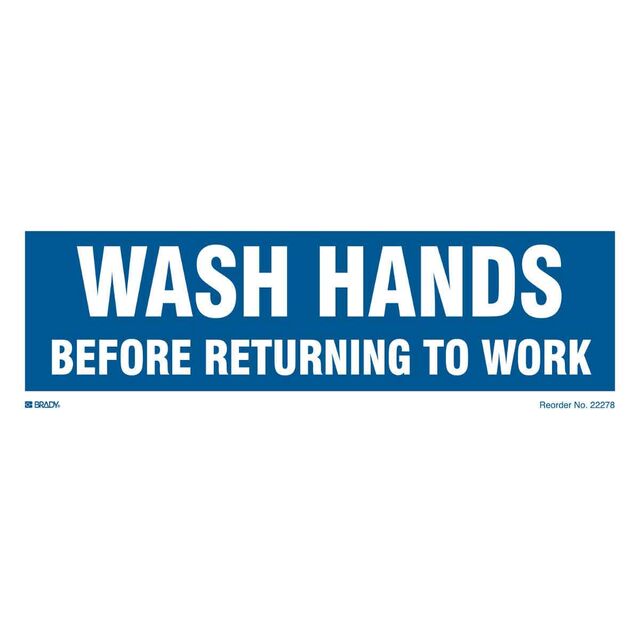 This is manufactured by Brady Corporation. The manufacturer part number is 22278KLS. Label with a size of 10.00" l x 3.50" w (254.0mm x 88.9mm). The product is rohs3 compliant. It is assigned with possible HTSUS value of 3926.90.9989. It has a classic white legend, blue background colour. The product brady®, is a highly preferred choice for users. The product is made from highly stable and reliable polyester. In addition, it is reach unaffected. Its typical moisture sensitivity level is not applicable. In addition, bulk is the available packaging type of the product. A bespoke label is a wash hands before returning to work label. The product is suitable for use with warning. It has a long 4 weeks standard lead time. The brady corporation's product offers user-desired applications. The product is designated with the ear99 code number.