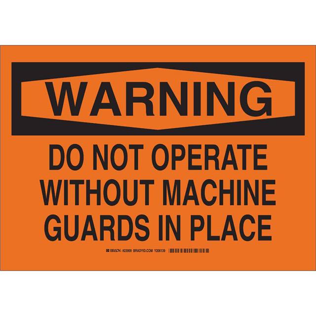 This is manufactured by Brady Corporation. The manufacturer part number is 23909. Label with a size of 14.00" l x 10.00" w (355.6mm x 254.0mm). The product is not applicable. It is assigned with possible HTSUS value of 3926.90.9985. It is shipped in bulk package . It has a classic black legend, orange background colour. The product brady®, is a highly preferred choice for users. The product is made from highly stable and reliable polyester. In addition, it is reach unaffected. Its typical moisture sensitivity level is not applicable. A bespoke label is a warning. do not operate without machine guards in place label. The product is suitable for use with warning. It has a long 4 weeks standard lead time. The product is designated with the ear99 code number.