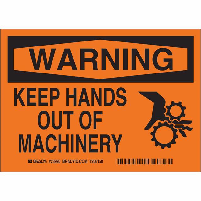 This is manufactured by Brady Corporation. The manufacturer part number is 23921. Label with a size of 14.00" l x 10.00" w (355.6mm x 254.0mm). The product is not applicable. It is assigned with possible HTSUS value of 3926.90.9985. It is shipped in bulk package . It has a classic black legend, orange background colour. The product brady®, is a highly preferred choice for users. The product is made from highly stable and reliable polyester. In addition, it is reach unaffected. Its typical moisture sensitivity level is not applicable. A bespoke label is a warning. keep hands out of machinery label. The product is suitable for use with warning. It has a long 4 weeks standard lead time. The product is designated with the ear99 code number.