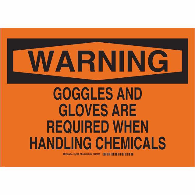 This is manufactured by Brady Corporation. The manufacturer part number is 34389. Label with a size of 14.00" l x 10.00" w (355.6mm x 254.0mm). The product is rohs3 compliant. It is assigned with possible HTSUS value of 8310.00.0000. It has a classic black legend, orange background colour. The product brady®, is a highly preferred choice for users. The product is made from highly stable and reliable aluminum. In addition, it is reach unaffected. Its typical moisture sensitivity level is not applicable. In addition, bulk is the available packaging type of the product. A bespoke label is a warning. goggles and gloves are required when handling chemicals label. The product is suitable for use with warning. It has a long 4 weeks standard lead time. The brady corporation's product offers user-desired applications. The product is designated with the ear99 code number.