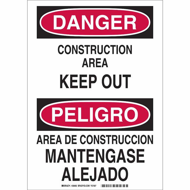 This is manufactured by Brady Corporation. The manufacturer part number is 38492. Label with a size of 14.00" l x 10.00" w (355.6mm x 254.0mm). The product is rohs3 compliant. It is assigned with possible HTSUS value of 8310.00.0000. It is shipped in bulk package . It has a classic black and red legend, white background colour. The product brady®, is a highly preferred choice for users. The product is made from highly stable and reliable aluminum. In addition, it is reach unaffected. Its typical moisture sensitivity level is not applicable. A bespoke label is a danger/peligro. construction area keep out/ area de construccion mantengase alejado label. The product is suitable for use with danger. The product is designated with the ear99 code number.