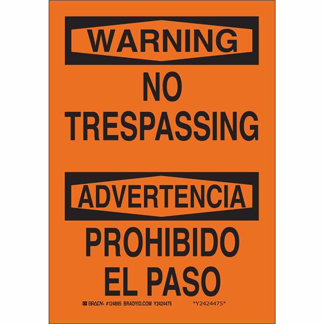 This is manufactured by Brady Corporation. The manufacturer part number is 39517. Label with a size of 20.00" l x 14.00" w (508.0mm x 355.6mm). The product is rohs3 compliant. It is assigned with possible HTSUS value of 3926.90.9985. It is shipped in bulk package . It has a classic black legend, orange background colour. The product brady®, is a highly preferred choice for users. The product is made from highly stable and reliable fiberglass. In addition, it is reach unaffected. Its typical moisture sensitivity level is not applicable. A bespoke label is a warning/advertencia. no trespassing/prohibido el paso label. The product is suitable for use with warning. It has a long 4 weeks standard lead time. The product is designated with the ear99 code number.