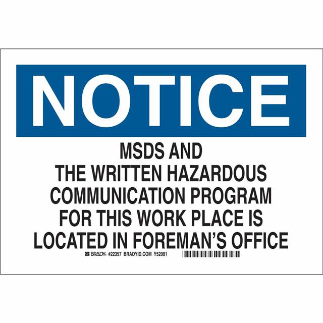 This is manufactured by Brady Corporation. The manufacturer part number is 40922. Label with a size of 14.00" l x 10.00" w (355.6mm x 254.0mm). The product is rohs3 compliant. It is assigned with possible HTSUS value of 8310.00.0000. It is shipped in bulk package . It has a classic black and blue legend, white background colour. The product brady®, is a highly preferred choice for users. The product is made from highly stable and reliable aluminum. In addition, it is reach unaffected. Its typical moisture sensitivity level is not applicable. A bespoke label is a notice. msds and the written hazardous communication program for this work place is located in the foreman's office label. The product is suitable for use with notice. The product is designated with the ear99 code number.