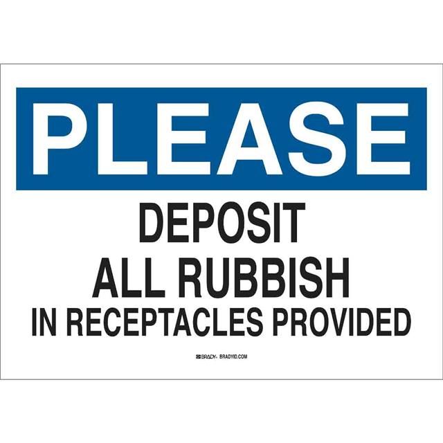 This is manufactured by Brady Corporation. The manufacturer part number is 42336. Label with a size of 14.00" l x 10.00" w (355.6mm x 254.0mm). The product is rohs3 compliant. It is assigned with possible HTSUS value of 8310.00.0000. It is shipped in bulk package . It has a classic black and blue legend, white background colour. The product brady®, is a highly preferred choice for users. The product is made from highly stable and reliable aluminum. In addition, it is reach unaffected. Its typical moisture sensitivity level is not applicable. A bespoke label is a please. deposit all rubbish in receptacles provided label. The product is suitable for use with warning. It has a long 4 weeks standard lead time. The product is designated with the ear99 code number.