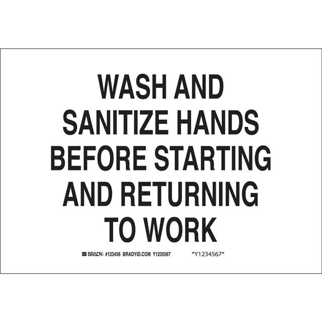 This is manufactured by Brady Corporation. The manufacturer part number is 42828. Label with a size of 14.00" l x 10.00" w (355.6mm x 254.0mm). The product is rohs3 compliant. It is assigned with possible HTSUS value of 8310.00.0000. It is shipped in bulk package . It has a classic black legend, white background colour. The product brady®, is a highly preferred choice for users. The product is made from highly stable and reliable aluminum. In addition, it is reach unaffected. Its typical moisture sensitivity level is not applicable. A bespoke label is a wash and sanitize hands before starting and returning to work label. The product is suitable for use with notice. It has a long 4 weeks standard lead time. The product is designated with the ear99 code number.