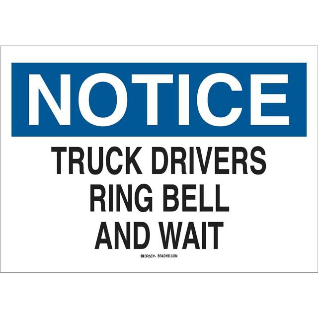 This is manufactured by Brady Corporation. The manufacturer part number is 43412. Label with a size of 14.00" l x 10.00" w (355.6mm x 254.0mm). The product is rohs3 compliant. It is assigned with possible HTSUS value of 8310.00.0000. It is shipped in bulk package . It has a classic black and blue legend, white background colour. The product brady®, is a highly preferred choice for users. The product is made from highly stable and reliable aluminum. In addition, it is reach unaffected. Its typical moisture sensitivity level is not applicable. A bespoke label is a notice. truck drivers ring bell and wait label. The product is suitable for use with notice. It has a long 4 weeks standard lead time. The product is designated with the ear99 code number.