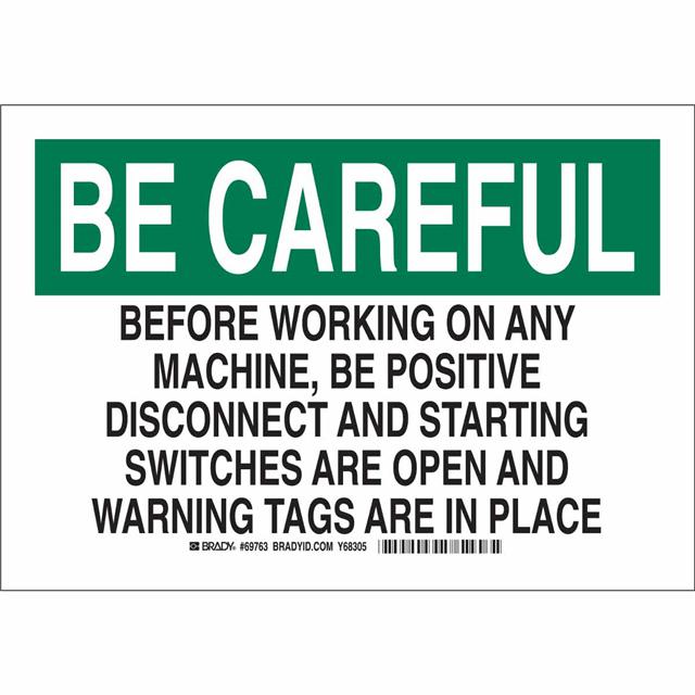 This is manufactured by Brady Corporation. The manufacturer part number is 69763. Label with a size of 14.00" l x 10.00" w (355.6mm x 254.0mm). The product is rohs3 compliant. It is assigned with possible HTSUS value of 3926.90.9985. It is shipped in bulk package . It has a classic black and green legend, white background colour. The product brady®, is a highly preferred choice for users. The product is made from highly stable and reliable fiberglass. In addition, it is reach unaffected. Its typical moisture sensitivity level is not applicable. A bespoke label is a be careful. before working on any machine, be positive disconnect and starting switches are open and warning tags are in place label. The product is suitable for use with warning. It has a long 4 weeks standard lead time. The product is designated with the ear99 code number.