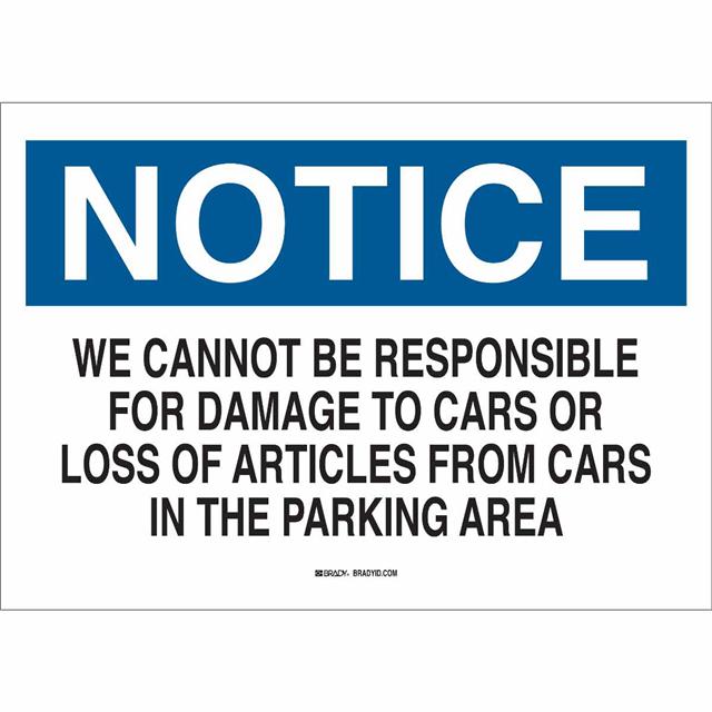 This is manufactured by Brady Corporation. The manufacturer part number is 75234. Label with a size of 14.00" l x 10.00" w (355.6mm x 254.0mm). The product is rohs3 compliant. It is assigned with possible HTSUS value of 3926.90.9985. It is shipped in bulk package . It has a classic black and blue legend, white background colour. The product brady®, is a highly preferred choice for users. The product is made from highly stable and reliable fiberglass. In addition, it is reach unaffected. Its typical moisture sensitivity level is not applicable. A bespoke label is a notice. we cannot be responsible for damage to cars or loss of articles from cars in the parking area label. The product is suitable for use with notice. It has a long 4 weeks standard lead time. The product is designated with the ear99 code number.