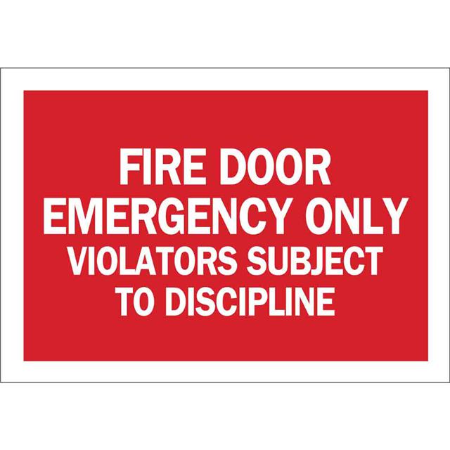 This is manufactured by Brady Corporation. The manufacturer part number is 84749. Label with a size of 14.00" l x 10.00" w (355.6mm x 254.0mm). The product is rohs3 compliant. It is assigned with possible HTSUS value of 3926.90.9985. It is shipped in bulk package . It has a classic white legend, red background colour. The product brady®, is a highly preferred choice for users. The product is made from highly stable and reliable polyester. In addition, it is reach unaffected. Its typical moisture sensitivity level is not applicable. A bespoke label is a fire door emergency only violators subject to discipline label. The product is suitable for use with fire. It has a long 4 weeks standard lead time. The product is designated with the ear99 code number.