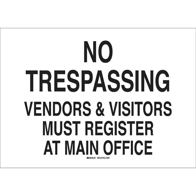 This is manufactured by Brady Corporation. The manufacturer part number is 90499. Label with a size of 20.00" l x 14.00" w (508.0mm x 355.6mm). The product is rohs3 compliant. It is assigned with possible HTSUS value of 3926.90.9985. It is shipped in bulk package . It has a classic black legend, white background colour. The product brady®, is a highly preferred choice for users. The product is made from highly stable and reliable fiberglass. In addition, it is reach unaffected. Its typical moisture sensitivity level is not applicable. A bespoke label is a no trespassing. vendors. visitors must register at main office label. The product is suitable for use with warning. It has a long 4 weeks standard lead time. The product is designated with the ear99 code number.