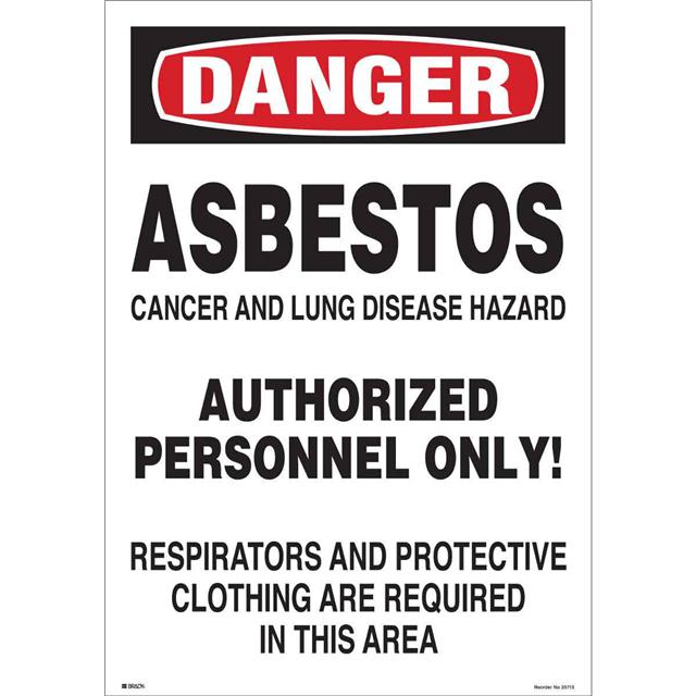 This is manufactured by Brady Corporation. The manufacturer part number is 25713LS. Label with a size of 20.00" l x 14.00" w (508.0mm x 355.6mm). The product is rohs3 compliant. It is assigned with possible HTSUS value of 3926.90.9985. It is shipped in bulk package . It has a classic black and red legend, white background colour. The product brady®, is a highly preferred choice for users. The product is made from highly stable and reliable polycoated tag. In addition, it is reach unaffected. Its typical moisture sensitivity level is not applicable. A bespoke label is a danger. asbestos cancer and lung disease hazard authorized personnel only. respirators and protective clothing are required in… label. The product is suitable for use with danger. It has a long 4 weeks standard lead time. The product is designated with the ear99 code number.