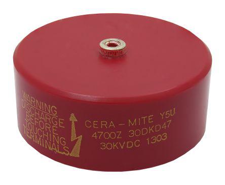 This is Single Layer Ceramic Capacitor SLCC 500pF 30000 V dc -20 → +80% Y5U Dielectric 715C Series Screw Terminal manufactured by Vishay. The manufacturer part number is 715C30DKT50. Its diameter is 26.7mm. The given dimensions of the product include 26.7 (dia.) x 34.5mm. The product is available in screw terminal configuration. It features a given value of +20% tolerance plus. The product 715c, is a highly preferred choice for users. In addition, the height is 34.5mm. It provides a 500 pf of capacitance value. While it has tolerance minus of -20%. It carries a 30000 v dc of voltage. Whereas, the minimum operating temperature of the product is -30°c. The dielectric options include y5u. It has a maximum operating temperature of +125°c. It features -20 → +80% of tolerance value. The terminal is a screw terminal type.