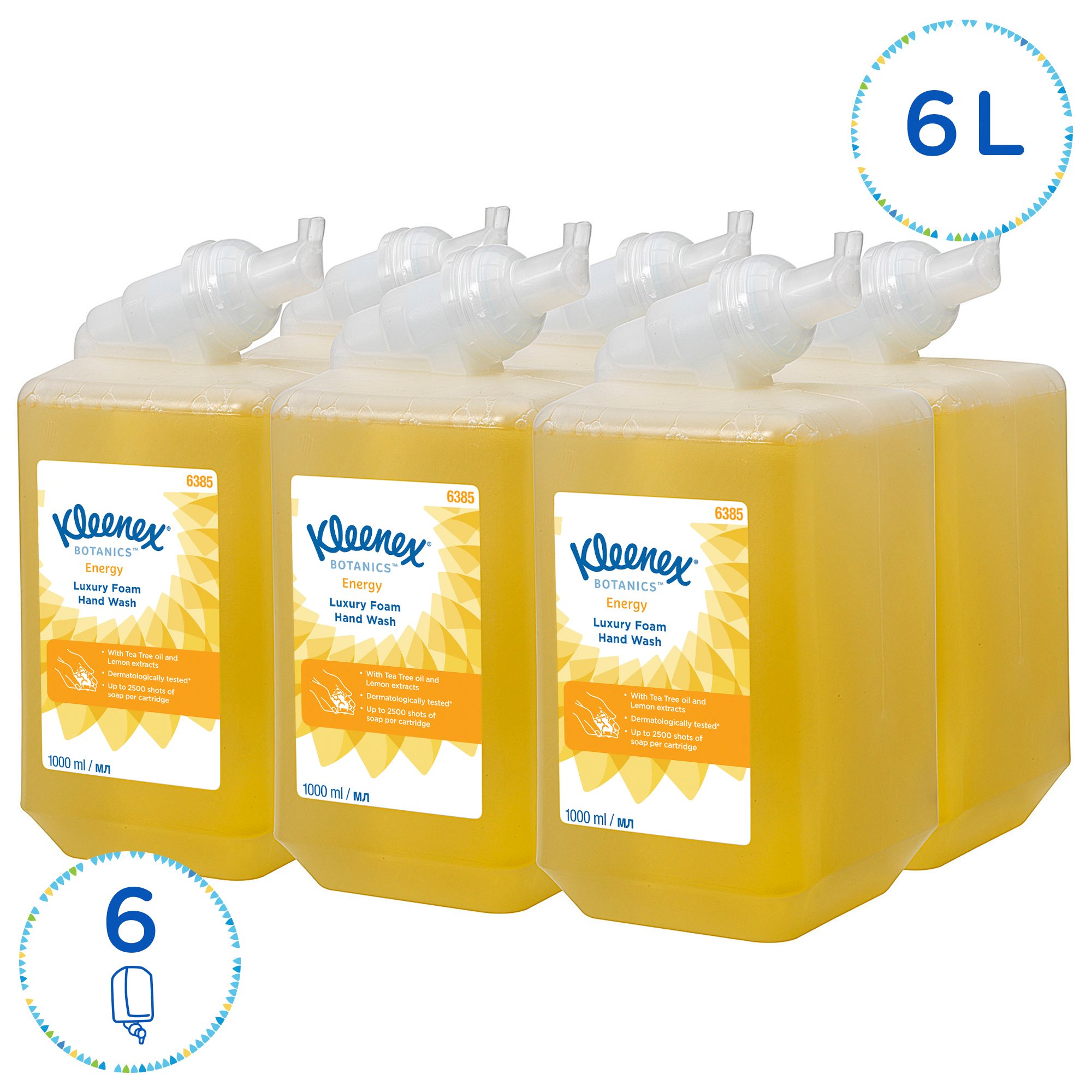 This is Zen Kleenex Energy Foaming Hand Cleaner - 6 x 1000ml Cassette manufactured by KLEENEX. The manufacturer part number is 6385. It is assigned with a trade name of kleenex energy. Better World Verification Options - eu ecolabel. Is it a better world product? yes. It has a decent yellow colour. It has a 1000ml volume unit . It features kleenex range. The package is a sort of cassette. In addition, it exhibits a/an zen fragrance . Its package size is approximately 6 x 1000ml . It has a/an 6948 aquarius soap dispenser, 7173 aquarius black soap dispenser, 8973 stainless steel soap dispenser compatible dispensers . In addition, it has an anti-bacterial feature no .