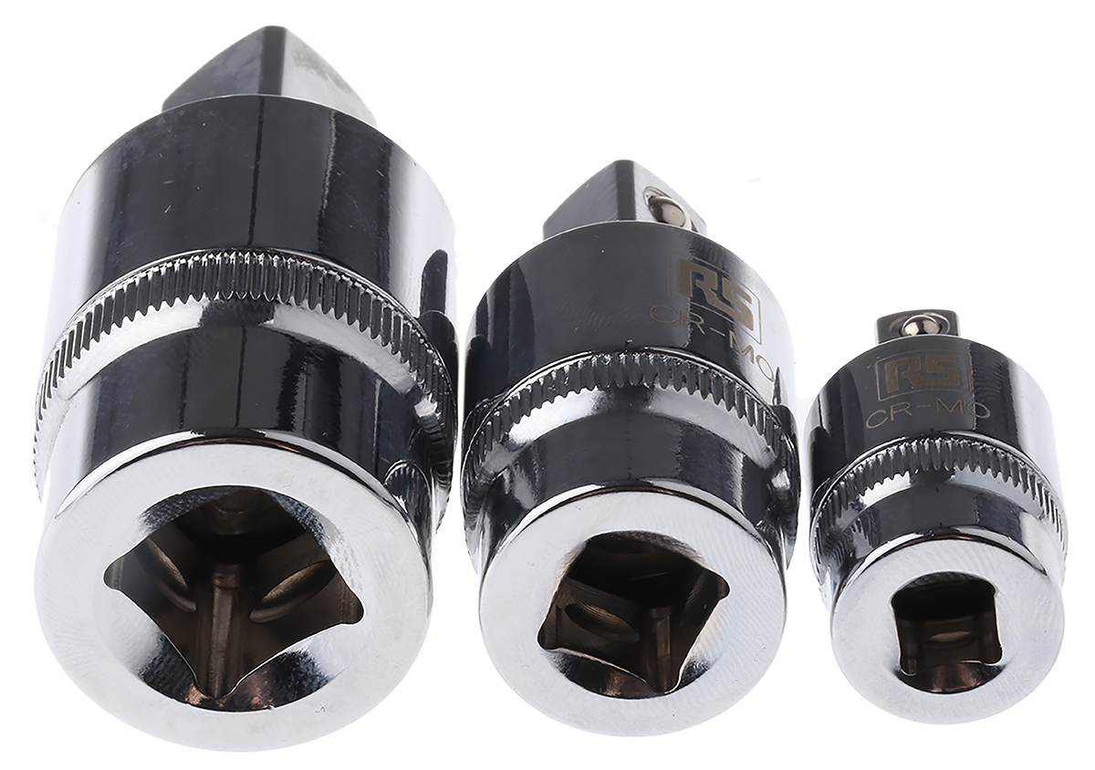 This is 1/2 in 1/4 in 3/8 in Square Universal Adapter Set manufactured by RS Pro. The manufacturer part number is 710-0659. The product has a drive size of 1/2 in, 1/4 in, 3/8 in. The product features a square drive. A quality product with a nice chrome finish. It comes in adapter configuration. The product is made from highly stable and reliable chrome molybdenum steel.