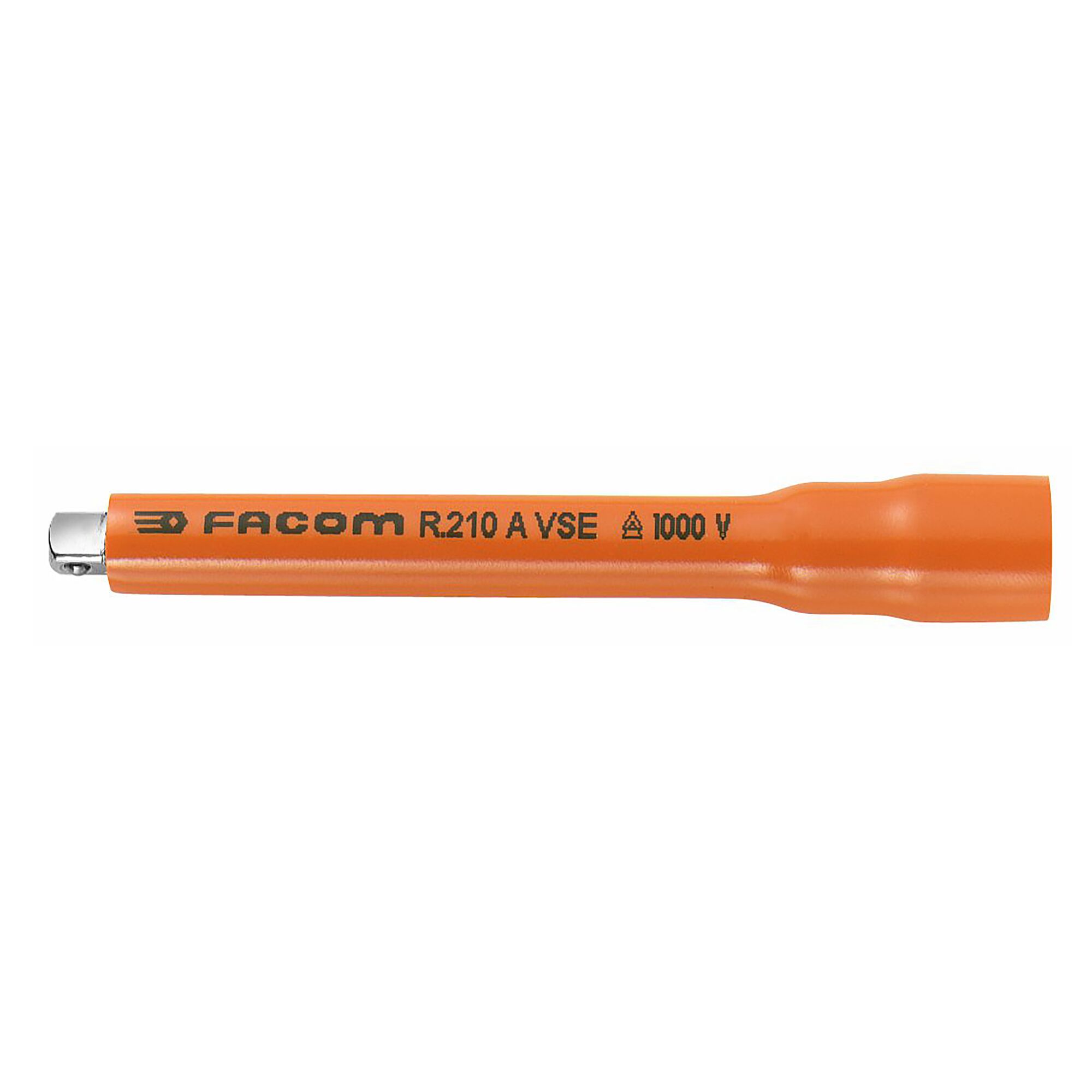 This is 1/4 in Extension manufactured by Facom. The manufacturer part number is R.210AVSE. It has a non sparking nature no . A quality product with a nice insulated finish. Its sub type is drive extension . The product is made from highly stable and reliable steel. It has an overall length of 116 mm. The product has a drive size of 1/4 in. It has a model r.210avse. It comes in insulated drive extension configuration. The product features a square drive.