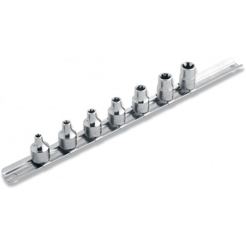 This is 3/8 in TX Socket manufactured by SAM. The manufacturer part number is JTX-J7R. The product has a drive size of 3/8 in. It has a model jtx-j7r. The product features a tx drive. It comes in set of 7 sockets 3/8" for torx® imprint on storage rack configuration. Its sub type is socket adapter set .