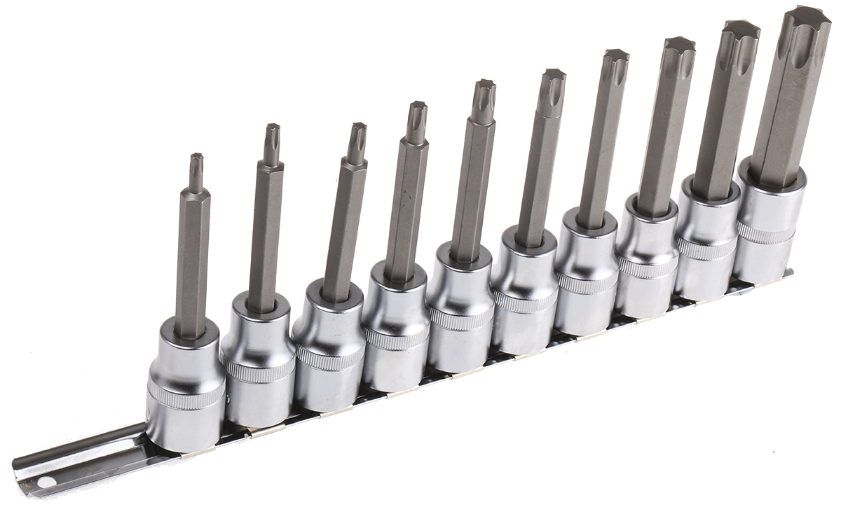 This is 10 pieces Chrome Vanadium Steel Driver Bit Torx Driver Bit manufactured by RS Pro. The manufacturer part number is 262-0303. The product features a square drive. The product is made from highly stable and reliable chrome vanadium steel. The socket's size is t20 → t70. The product has a drive size of 1/2 in. The product consists of 10 pieces.