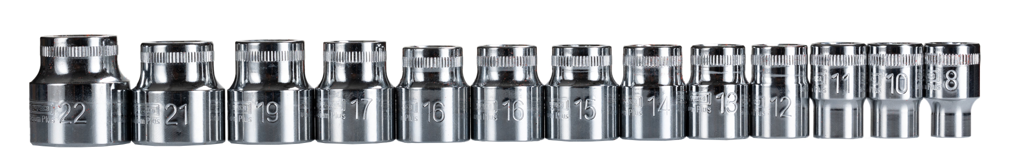 This is C10-E18H2RS 18 Pieces Socket Set 3/8 in Square Drive manufactured by RS Pro. The manufacturer part number is 125-3053. It is available in metric package. A quality product with a nice chrome finish. The product features a square drive. The product has a drive size of 3/8 in. The product consists of 18 pieces.