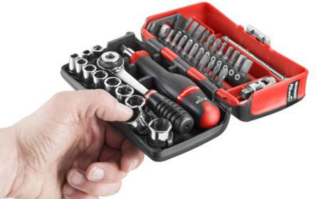 This is 40 Pieces Socket Set 1/4 in Hexagon Drive manufactured by Facom. The manufacturer part number is R2NANOV217IM. The product features a hexagon drive. This is a type of socket & ratchet set, a set with user-desired tools. The product has a drive size of 1/4 in. Moreover, it has bits (11), extension bar (2), phillips n° 1, phillips n° 2, phillips n° 3, reversible ratchet, sockets (7), tx 40, tx10, tx15, tx20, tx25, tx27, tx30, universal joint, 1/4 in bit adapter, 1/4 in bit holder, 1/4 in hex sockets (10), 1/4 in spinner with 2 component handle set contents . The product consists of 40 pieces.