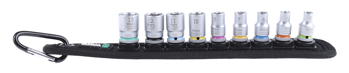 This is 9 Pieces Socket Set 1/4 in Hexagon Drive manufactured by Wera. The manufacturer part number is 05003883001. VDE/1000V Approval Options - no. The product is insulated no . The 6 point socket offers profound benefits and is well-designed. It has an overall length of 266mm. The product has a drive size of 1/4 in. Moreover, it has socket set contents . socket set is a versatile product designed to provide user-defined applications. The product features a square drive. The product consists of 9 pieces.