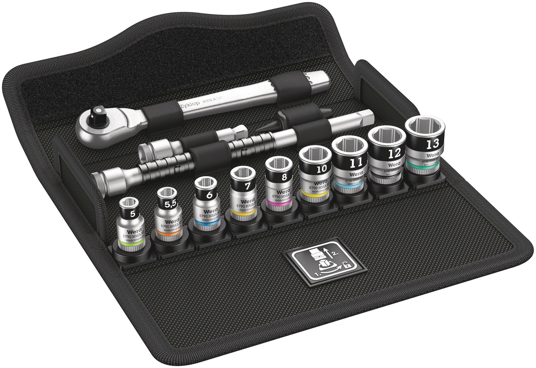 This is 13 Pieces Socket Set 1/4 in Hexagon Square Drive manufactured by Wera. The manufacturer part number is 05003756001. It is available in metric package. The product features a square drive. The socket's size is 5 mm, 5.5 mm, 6 mm, 7 mm, 8 mm, 10 mm, 11 mm, 12 mm, 13mm. The product has a drive size of 1/4 in. The product consists of 13 pieces.