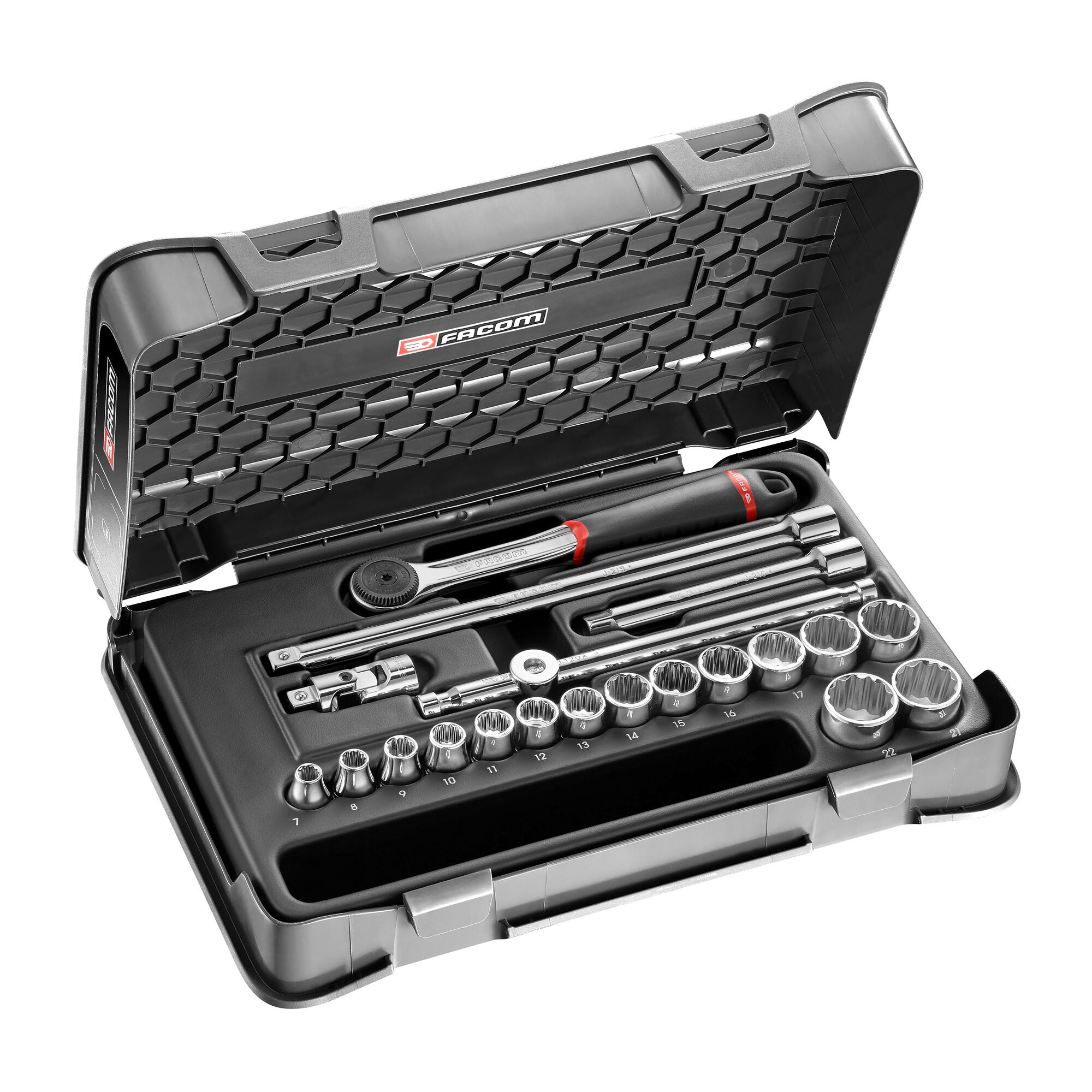This is 3/8' SOCKET SET 12PT MM J.161B 20PC manufactured by Facom. The manufacturer part number is J.161-3P12. It is available in metric package. VDE/1000V Approval Options - no. A quality product with a nice bright chrome finish. The product features a square drive. The product is made from highly stable and reliable chrome vandium steel. The socket's size is 7 , 8 , 9 , 10 , 11 , 12 , 13 , 14 , 15 , 16 , 17 , 18 , 19 , 21 , 22mm. The product has a drive size of 3/8 in. It has a model j.161-3p12. Moreover, it has ratchet, sockets, extensions, joint, sliding handle set contents . The product consists of 20 pieces.