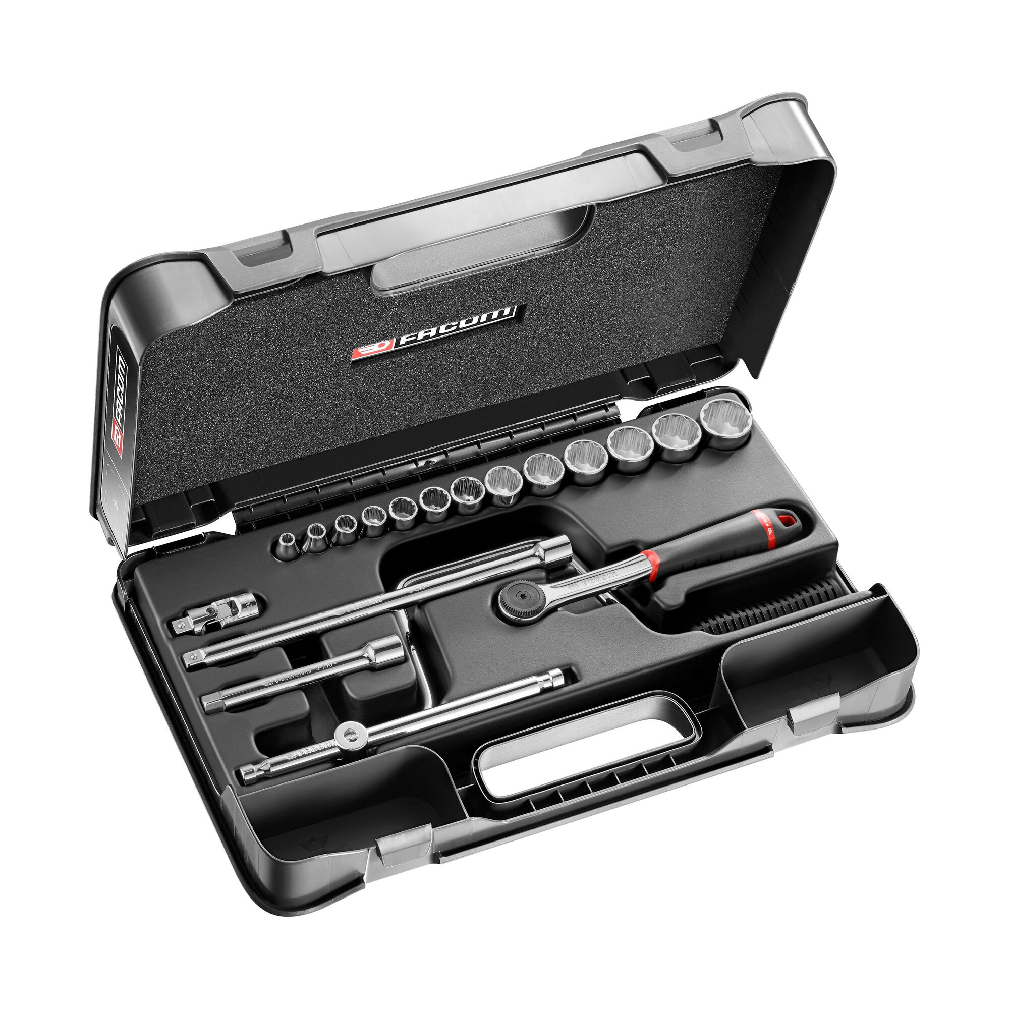 This is 3/8' SOCKET SET 12PT IN J.161B 19PC manufactured by Facom. The manufacturer part number is J.161-3P12U. It is available in imperial package. VDE/1000V Approval Options - no. A quality product with a nice bright chrome finish. The product features a square drive. The product is made from highly stable and reliable chrome vandium steel. The socket's size is 1/4" , 5/16" , 3/8" , 7/16" , 1/2" , 9/16" , 5/8" , 11/16" , 3/4" , 13/16" , 7/8" , 15/16" , 1". The product has a drive size of 3/8 in. It has a model j.161-3p12u. Moreover, it has ratchet, sockets, extensions, joint, sliding handle, speed brace set contents . The product consists of 19 pieces.